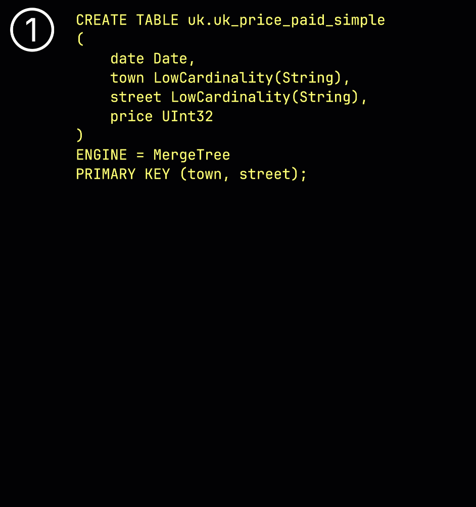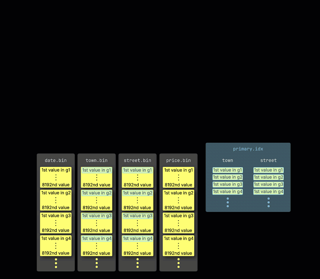 To illustrate how the sparse primary index is built, we use the uk_price_paid_simple table along with some animations.